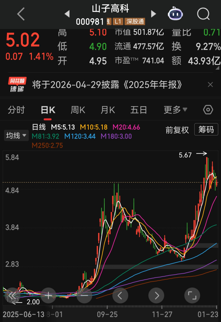 从K线图的技术走势来看,山子高科下周的走势脉络其实很清晰,大概率会走出“高位震荡、先弱后稳”的行情,核心波动区间就在4.8-5.2元,这两个价位成了短期走势的关键节点。其中4.8元是强支撑位,从周四和周五的盘面能看出,这个位置有大量资金护盘,是主力认可的底部区域;而5.2元则是短期压力位,前期套牢盘和解套盘的抛压都集中在这个位置,想要突破并不容易。